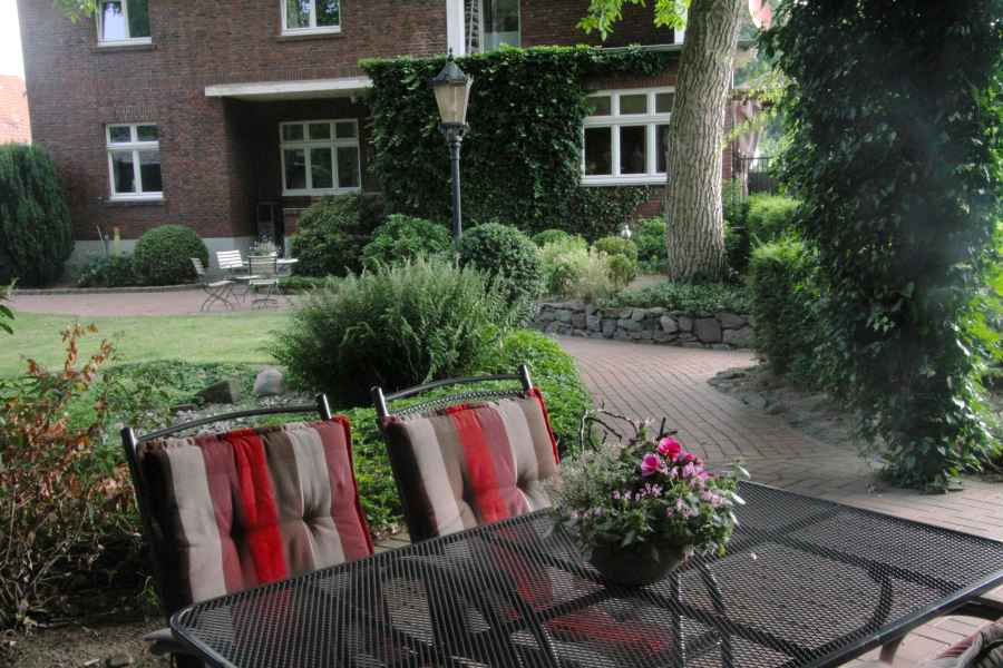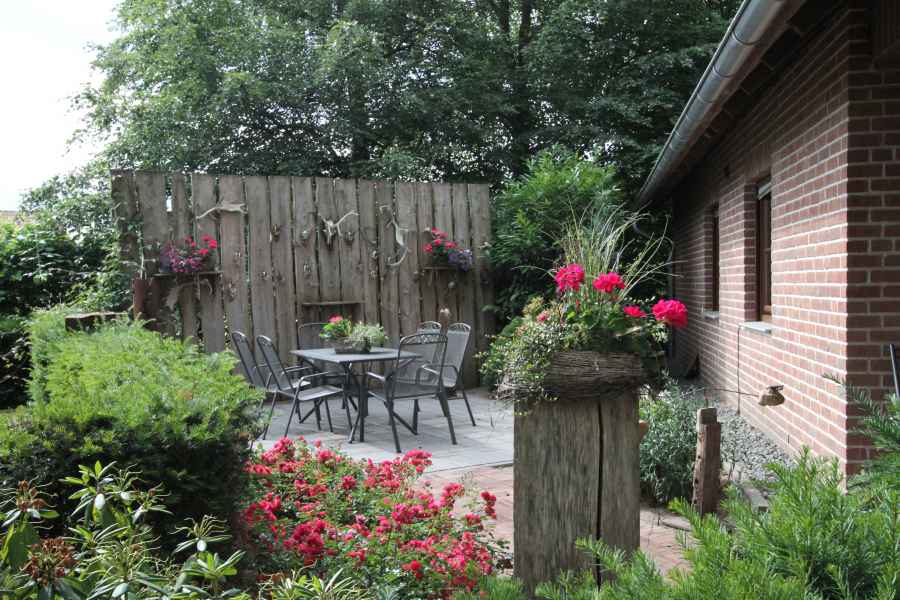 - großer, überdachter Balkon überdachte Gartenterrasse mit Sitzecke, Grillplatz, Rasenfläche und Liegestühlen