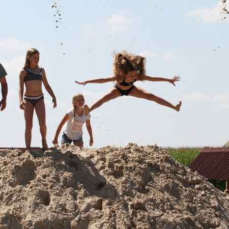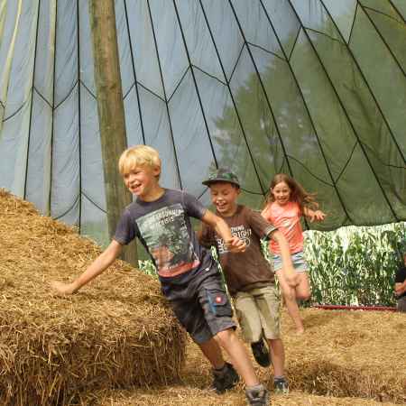 ... beim Toben im Heu, Rutschen auf Holzrutschen oder beim Erklimmen des Dachbodens über einen Kletterbaum. Ein riesiger Sandhaufen, das Pelletbad und unsere Strohburg warten darauf erobert zu werden.
