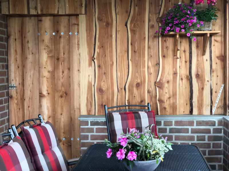 - großer, überdachter Balkon überdachte Gartenterrasse mit Sitzecke, Grillplatz, Rasenfläche und Liegestühlen